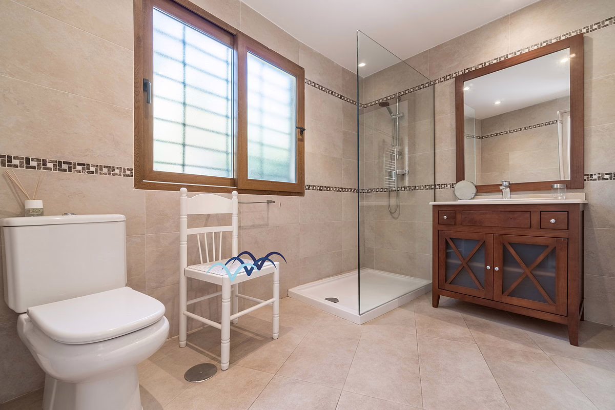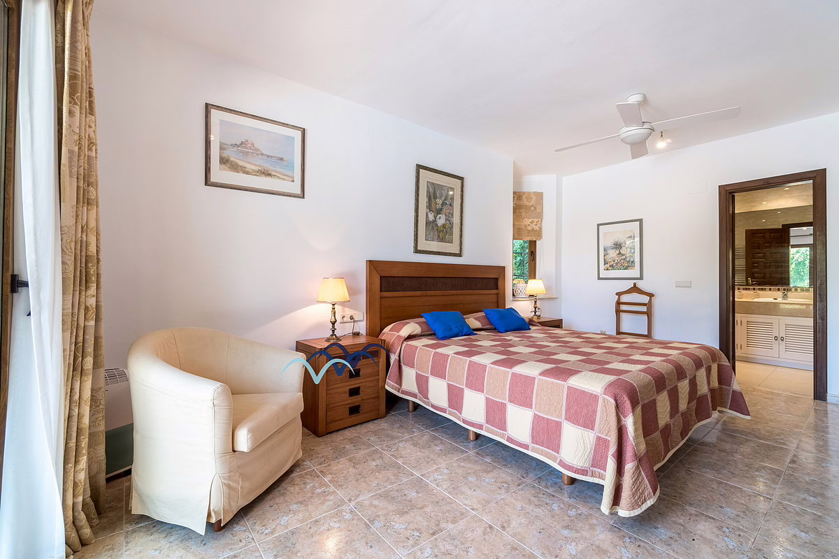 To the right of the pool, there is an annex with another en-suite bedroom and a private terrace, also covered with a pergola and retractable canvas awning. Next to the annex, there is an additional toilet and shower for pool users’ convenience.