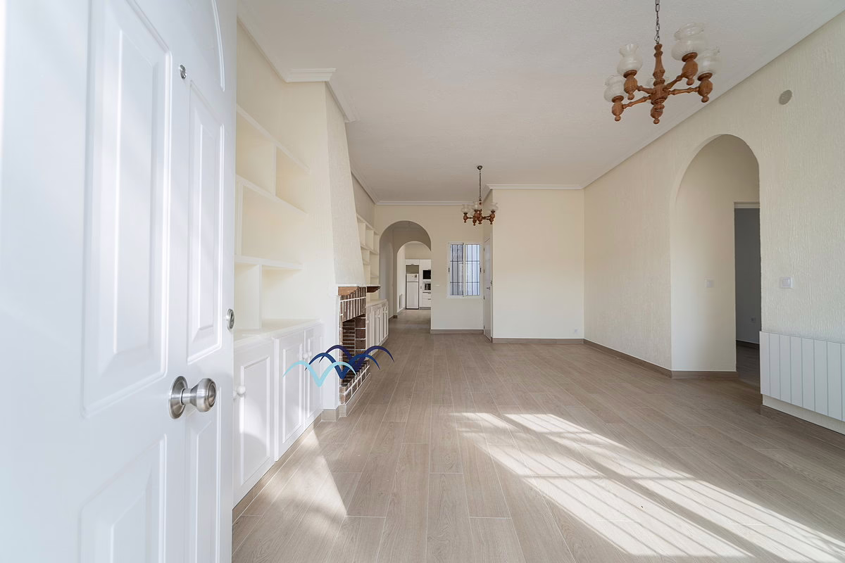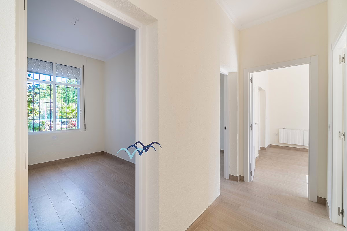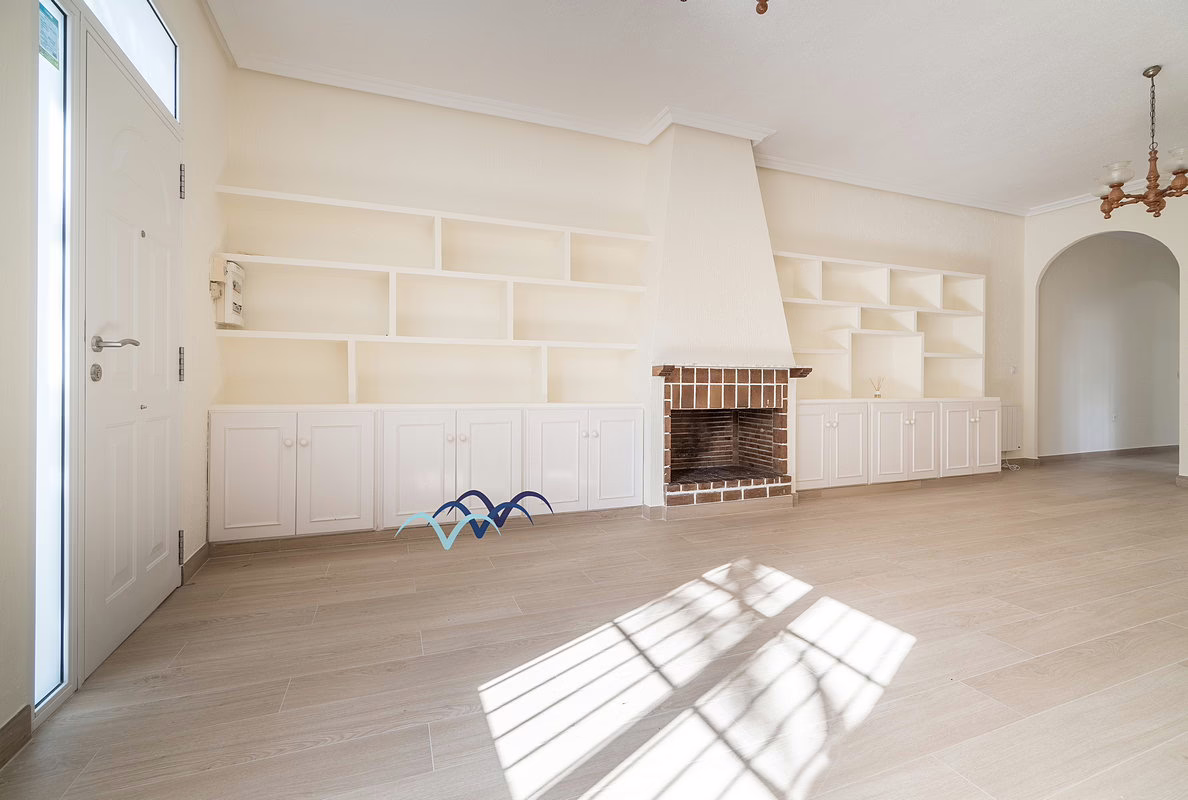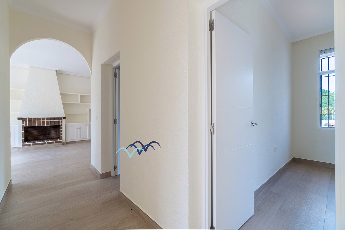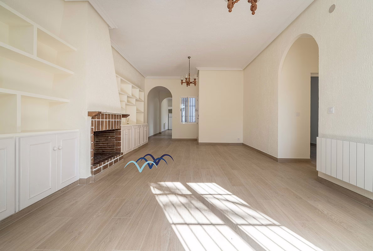 The ground floor includes new floors and doors, four bedrooms, two new bathrooms, a new kitchen, new wall radiators and a fireplace in the living room. Outside, the patio features a beautifully tiled barbecue area with a built-in counter — perfect for entertaining.