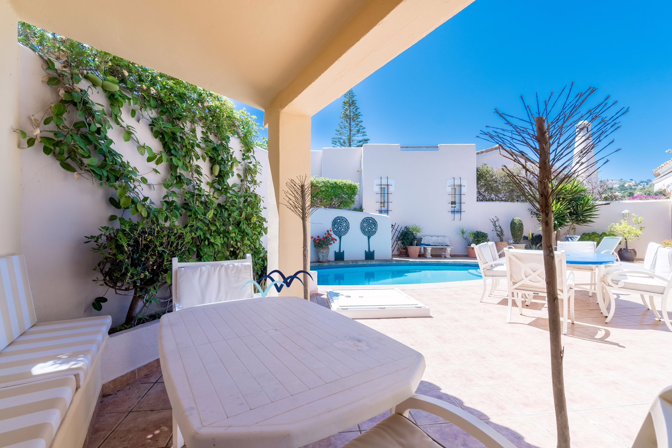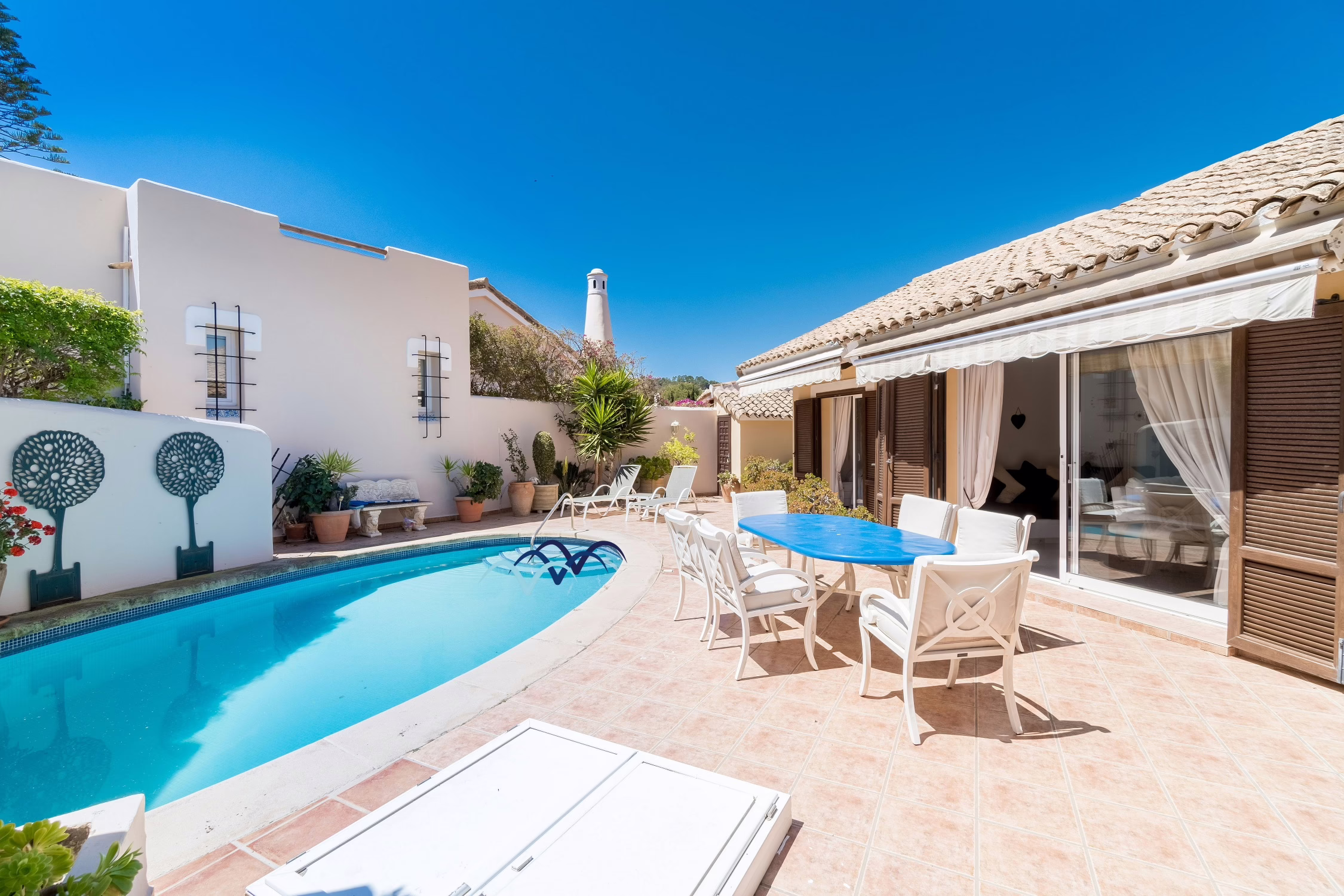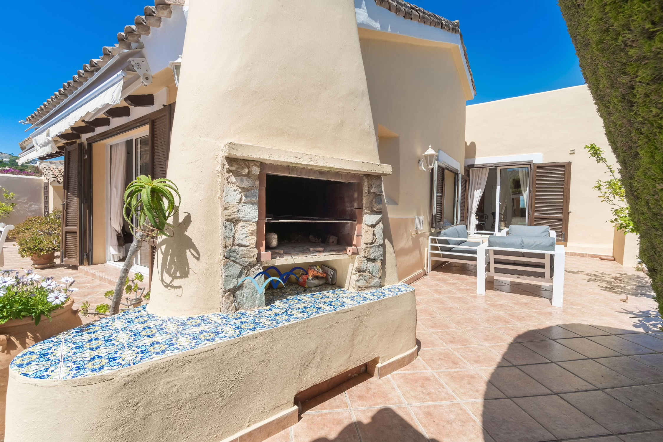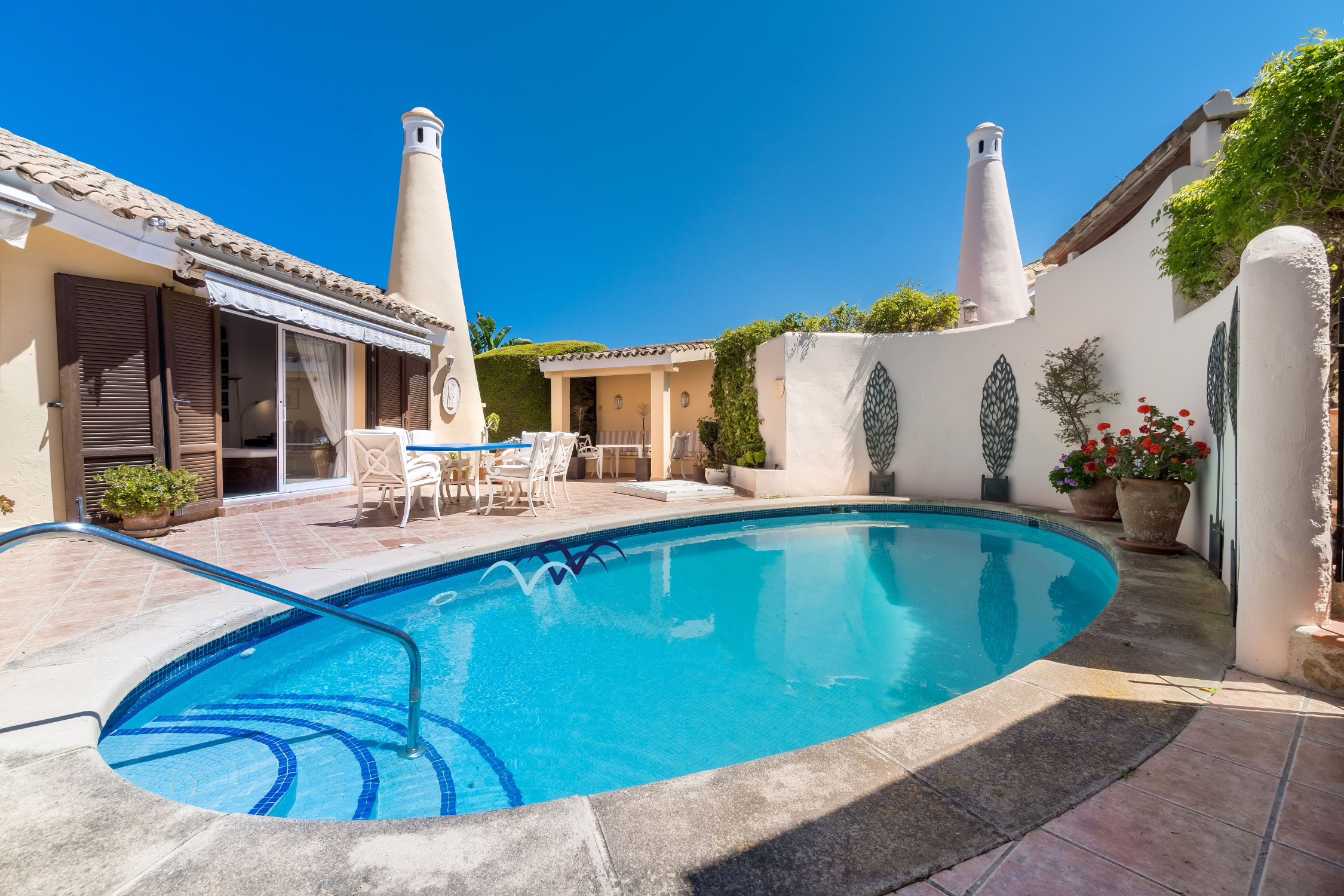 Step outside to your own private oasis. The villa features a sparkling private swimming pool surrounded by a sunny terrace, ideal for cooling off on warm Spanish afternoons or relaxing on a sun lounger with a good book. There is also outdoor dining space, perfect for enjoying al-fresco meals or evening drinks under the stars.