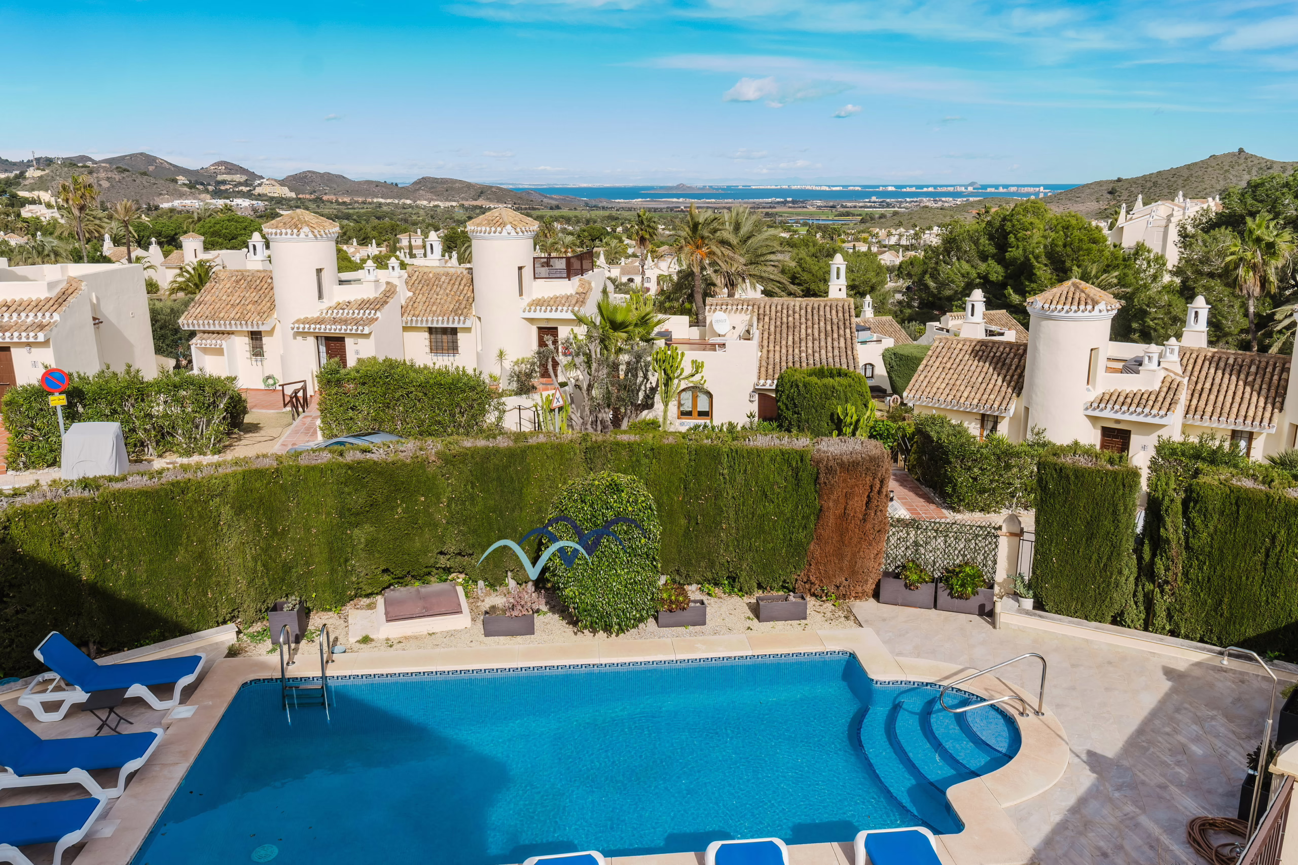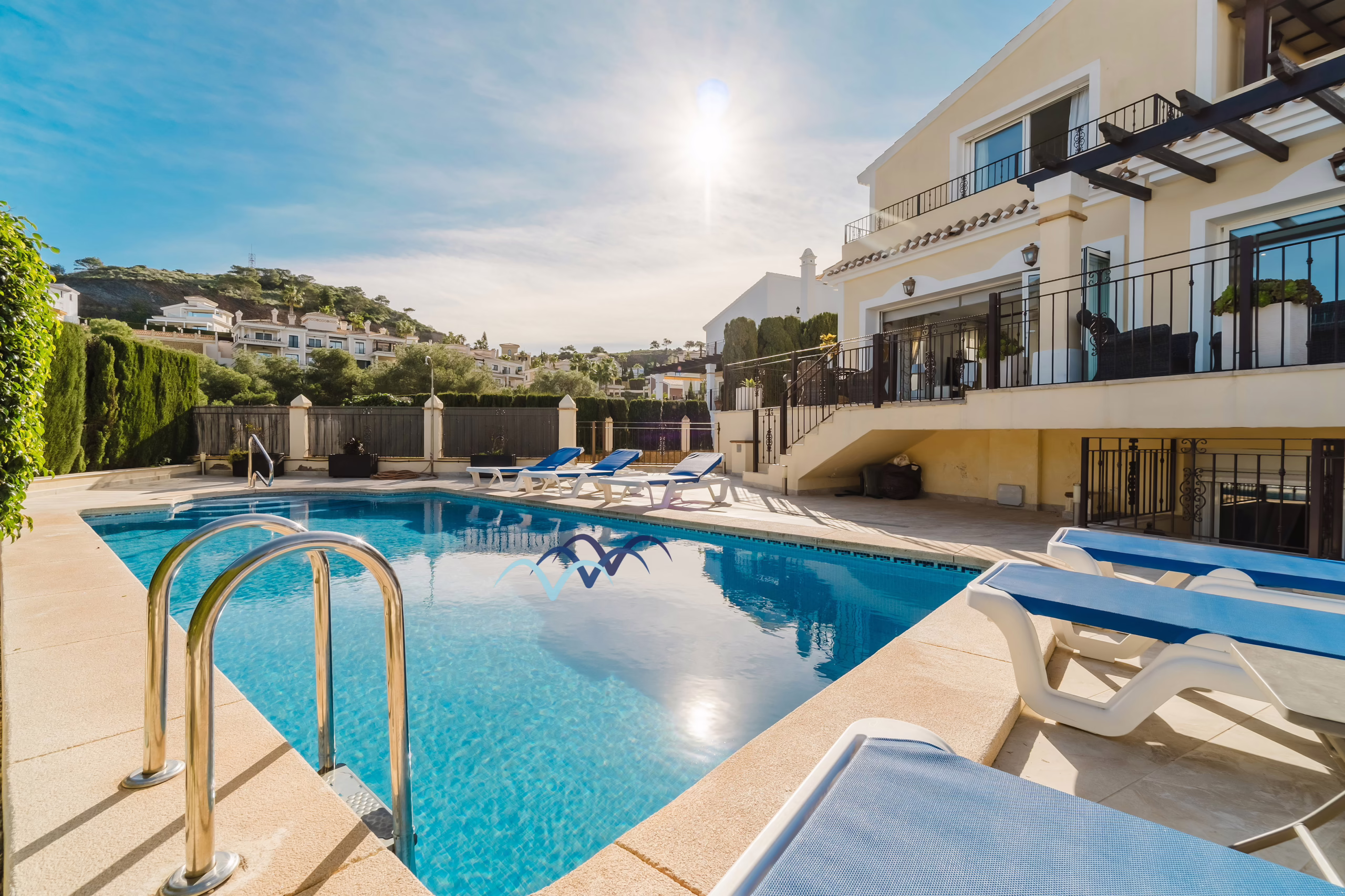 In the pool terrace there is plenty of space for sunbeds with the adition of a large side garden area with artificial grass for kids to play.