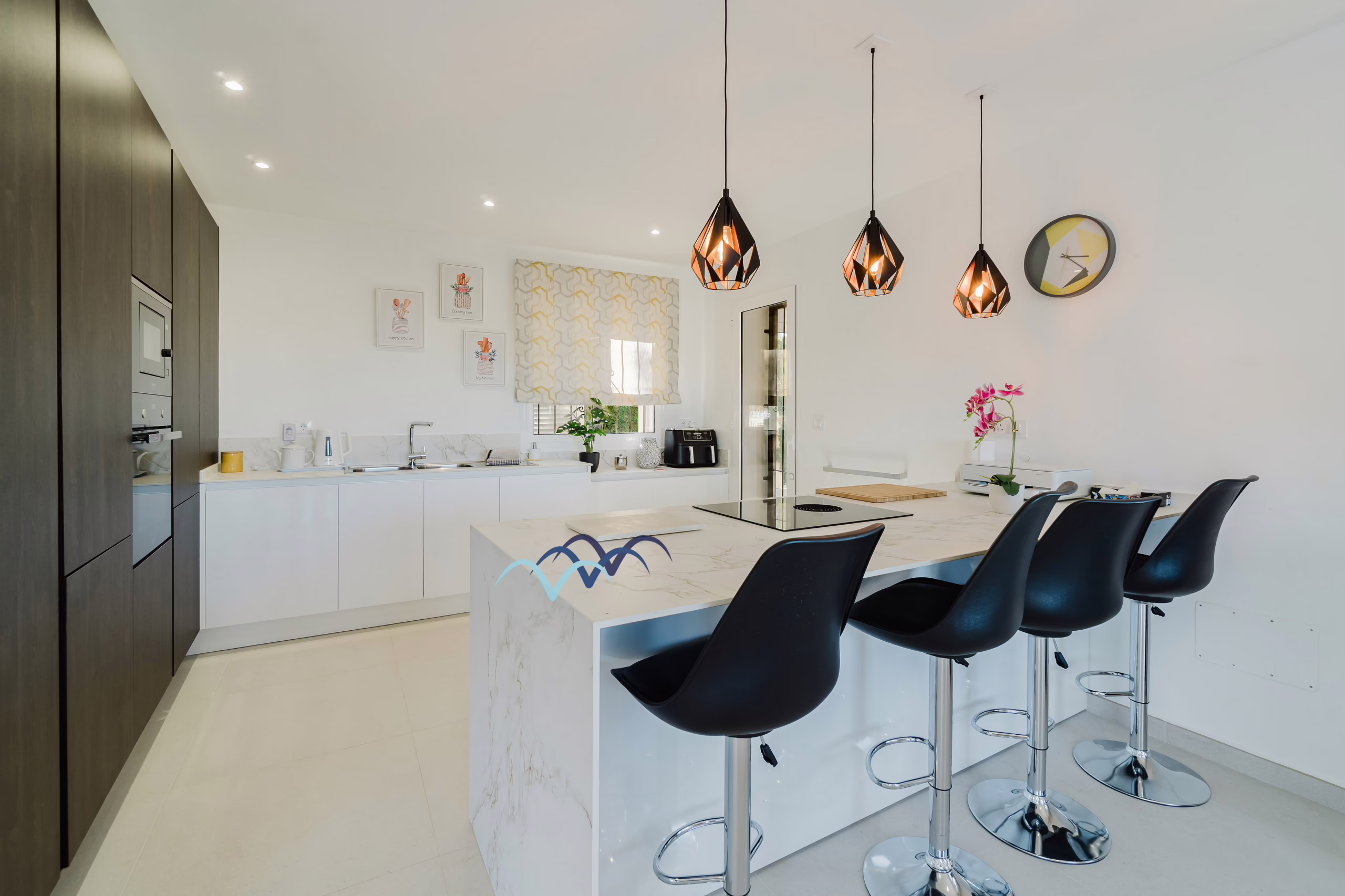 The modern open kitchen with a central island has also a utility room at the side.