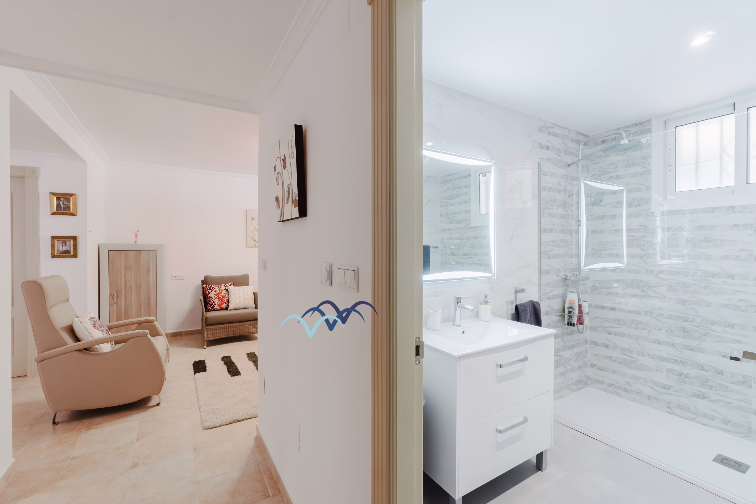 The main living floor has been conveniently redesigned with an open plan to enjoy the sea views from the open kitchen to the dining and living room. There are side to side folding patio doors in front of the seating area to the beautiful view of the Mar Menor. Modern tiles have been used to renovate this floor.